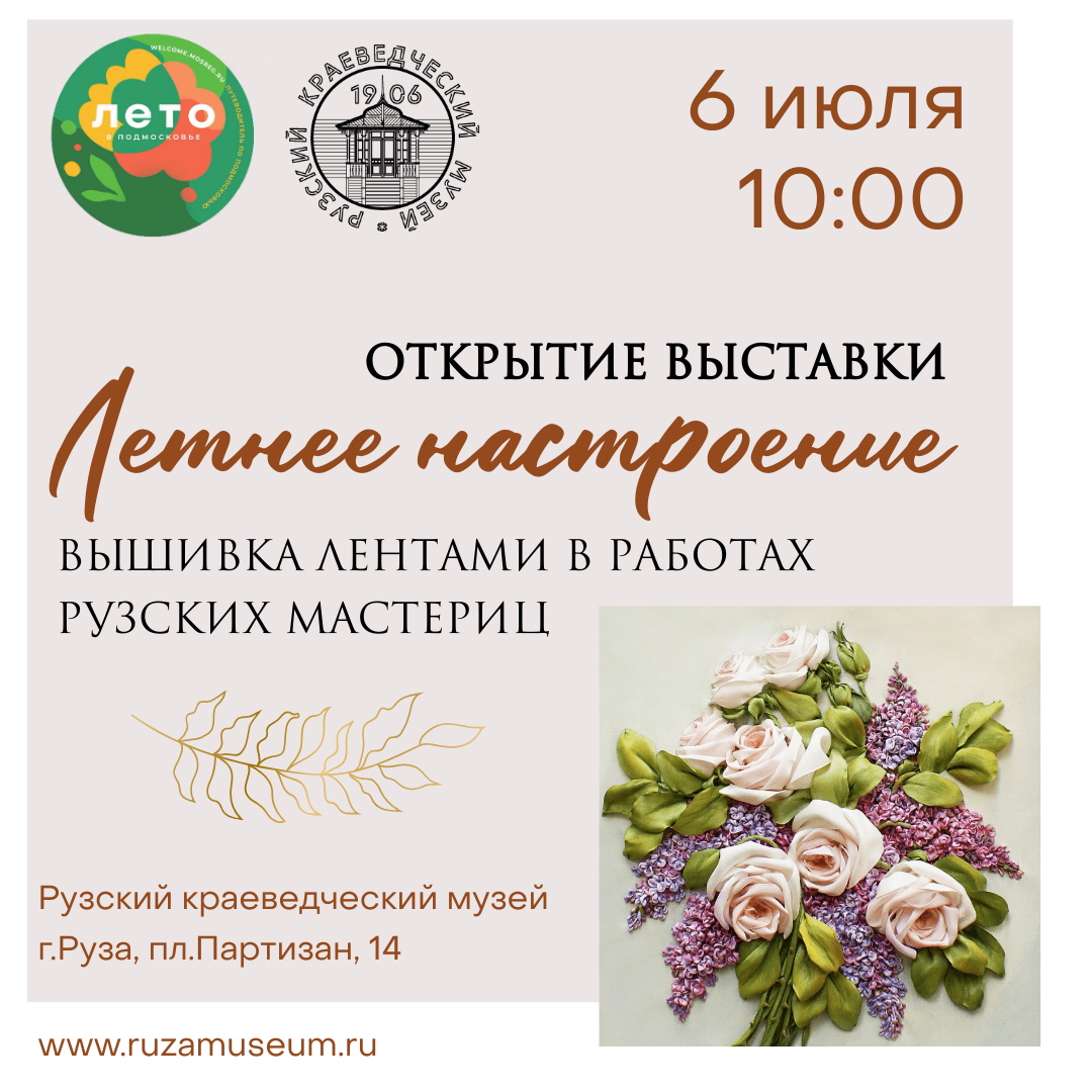 6 июля в 10.00 Рузский краеведческий музей приглашает жителей и гостей муниципалитета на открытие выставки «Летнее настроение. Вышивка лентами в работах Рузских мастериц».