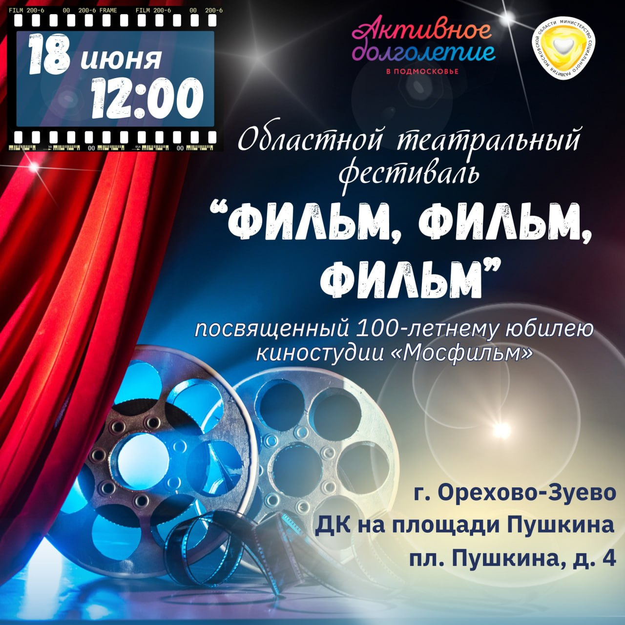 Второй областной театральный фестиваль, посвящённый 100-летию киностудии «Мосфильм», пройдёт в Орехово-Зуевском округе В этом году киностудия «Мосфильм» отмечает 100-летний юбилей.