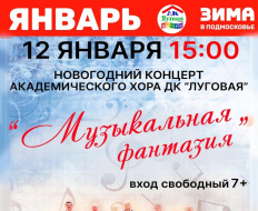Дом культуры «Луговая» городского округа Лобня приглашает жителей и гостей города на концерт «Музыкальная фантазия». На сцене ДК выступит Академический хор ДК «Луговая». Руководитель коллектива - почётный работник культуры города Лобня Андрей Рязанцев, концертмейстер - Татьяна Рязанцева.